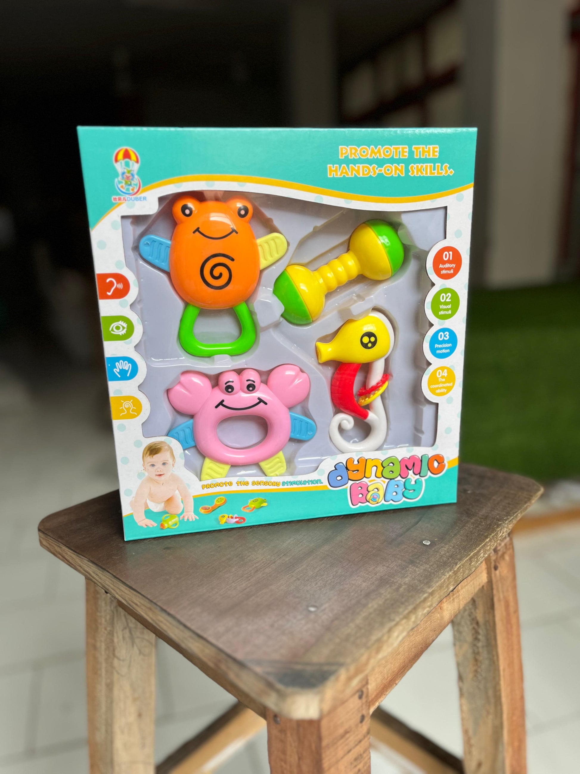 • The rattles produce gentle sounds or noises when shaken, providing auditory stimulation for babies. These sounds may be soft rattling noises, gentle bells, or other soothing sounds. • Many baby rattles are designed with handles or shapes that are easy for little hands to grasp. This helps babies develop their fine motor skills, hand-eye coordination, and encourages them to practice gripping and shaking.
