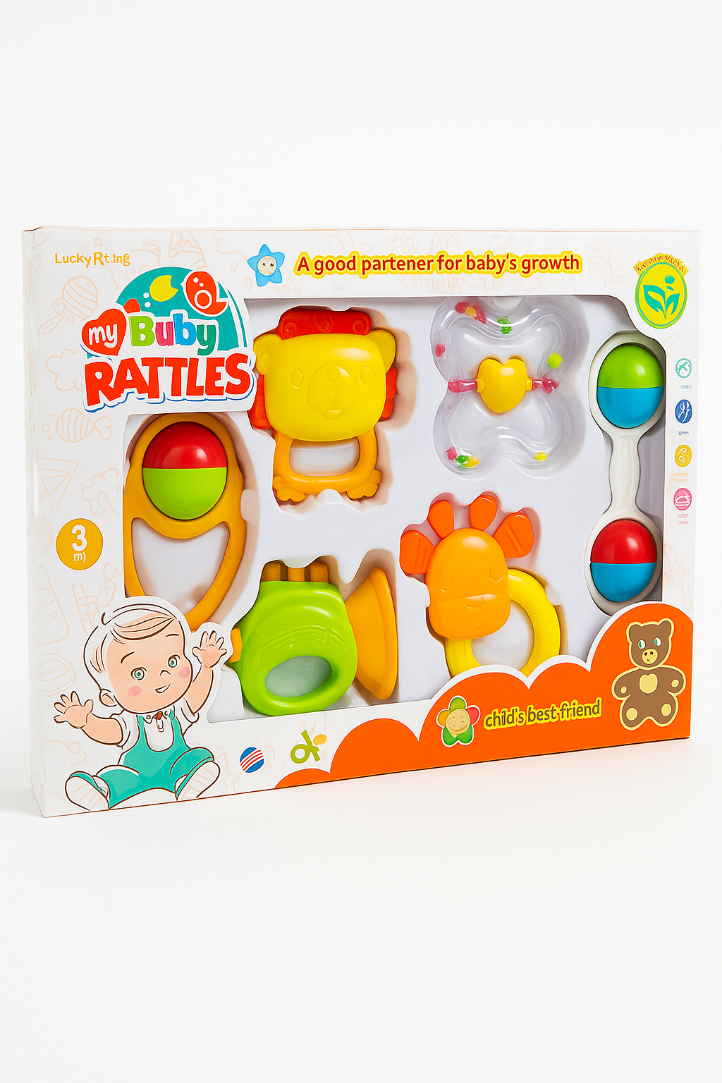• Depending on the specific rattle, it might include educational features such as numbers, letters, shapes, or interactive elements that introduce cause-and-effect relationships, encouraging early learning.
