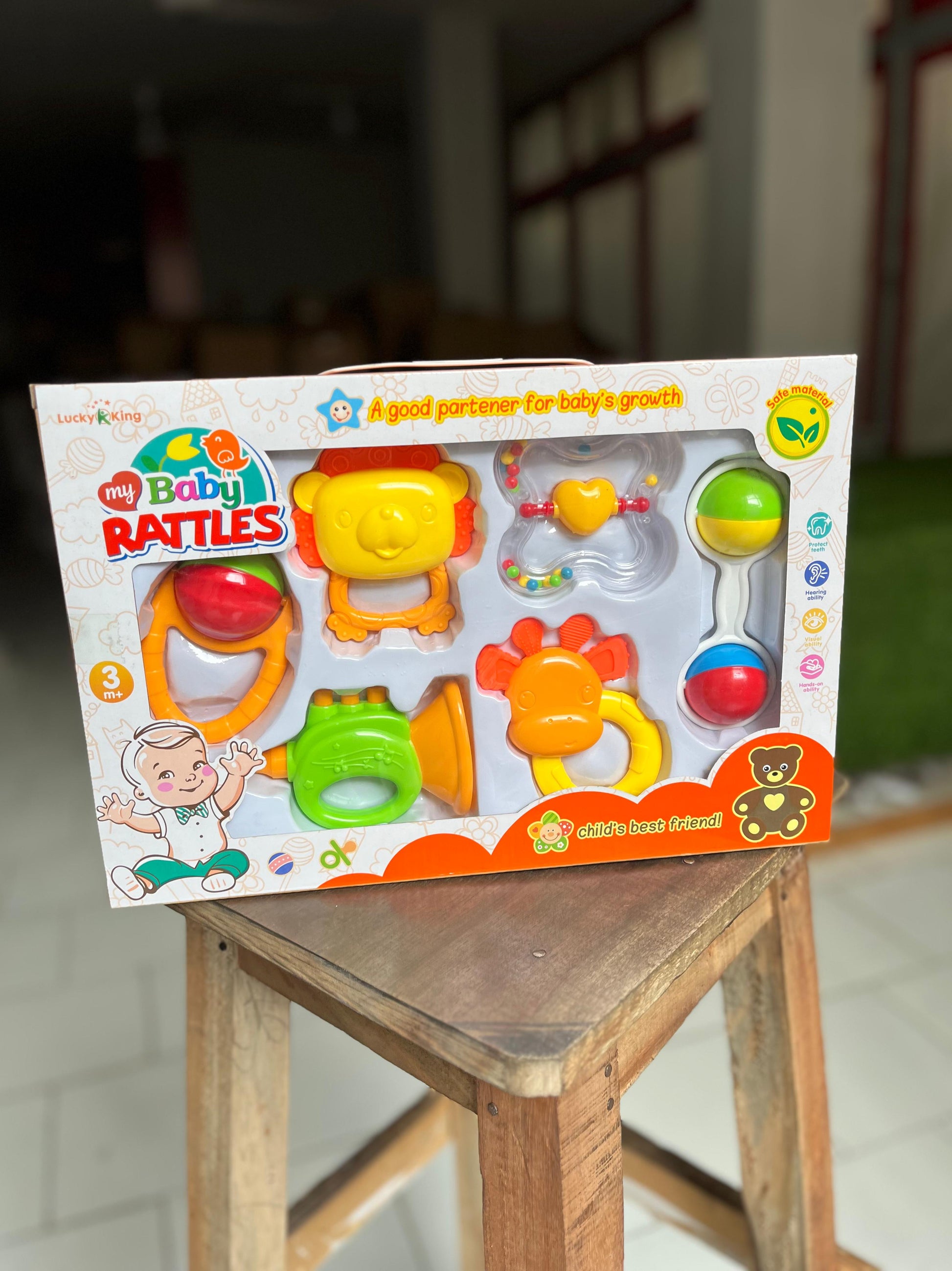 • These rattles are typically made from baby-safe materials such as BPA-free plastics, soft fabrics, or natural wood. They are designed to be durable, non-toxic, and free from small parts that could pose a choking hazard.