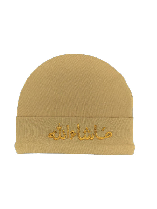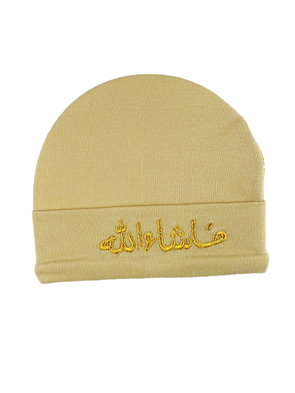 Introducing our Baby's First Cap - the perfect accessory to protect your little one from the evil eye. Made from a double layer of soft organic cotton, this cap is gentle on your baby's delicate skin and provides breathability to keep them comfortable all day long. Featuring a beautiful Masha Allah Arabic calligraphy on the forehead, this cap is not only functional but also adds a touch of style to your baby's outfit. Designed for 0-2 months, this cap is the perfect size for your newborn. Made with organic cotton, this cap is a safe and skin-friendly choice for your little one. Upgrade your baby's wardrobe with this premium quality cap today. Available in many colors.