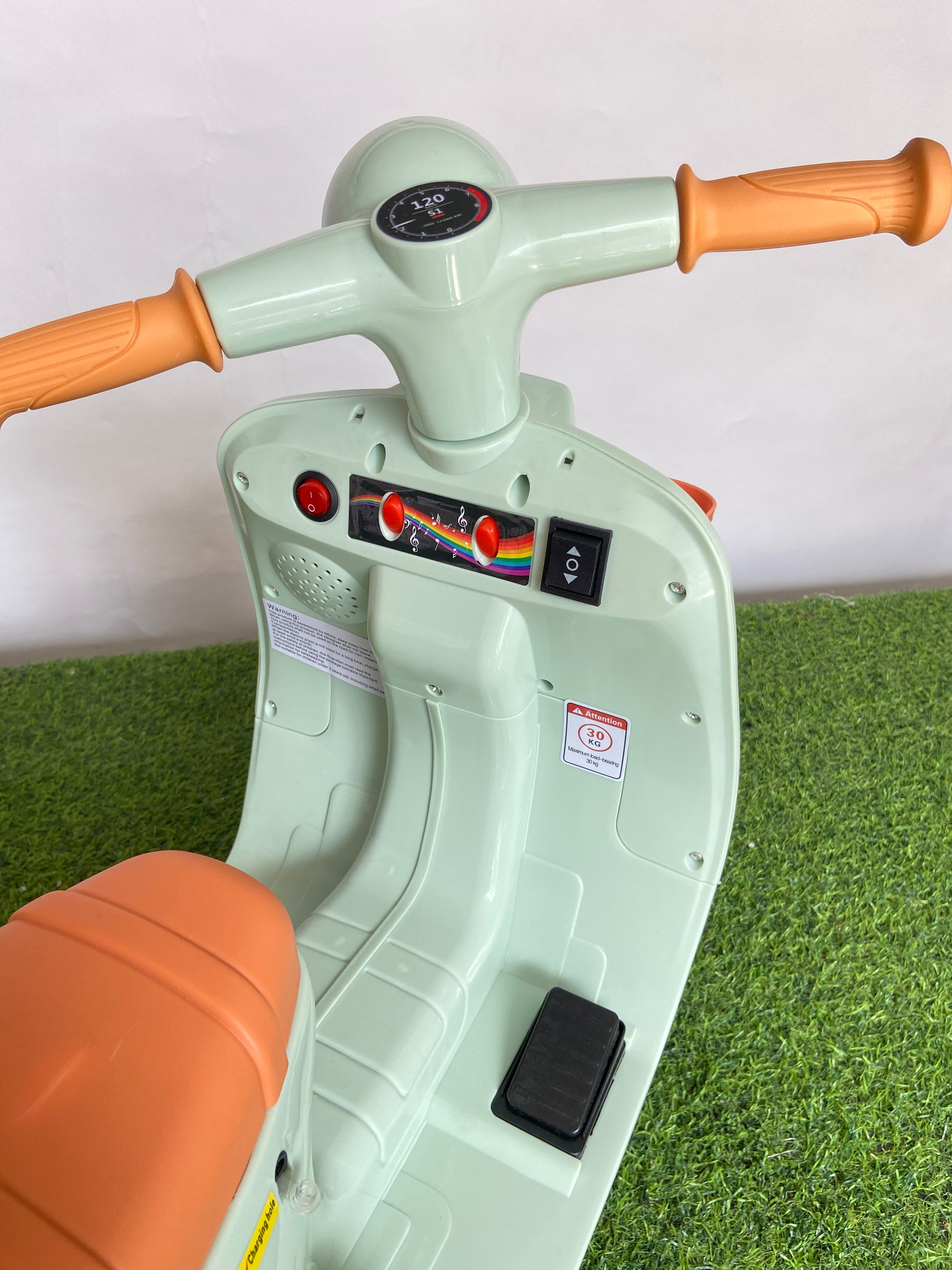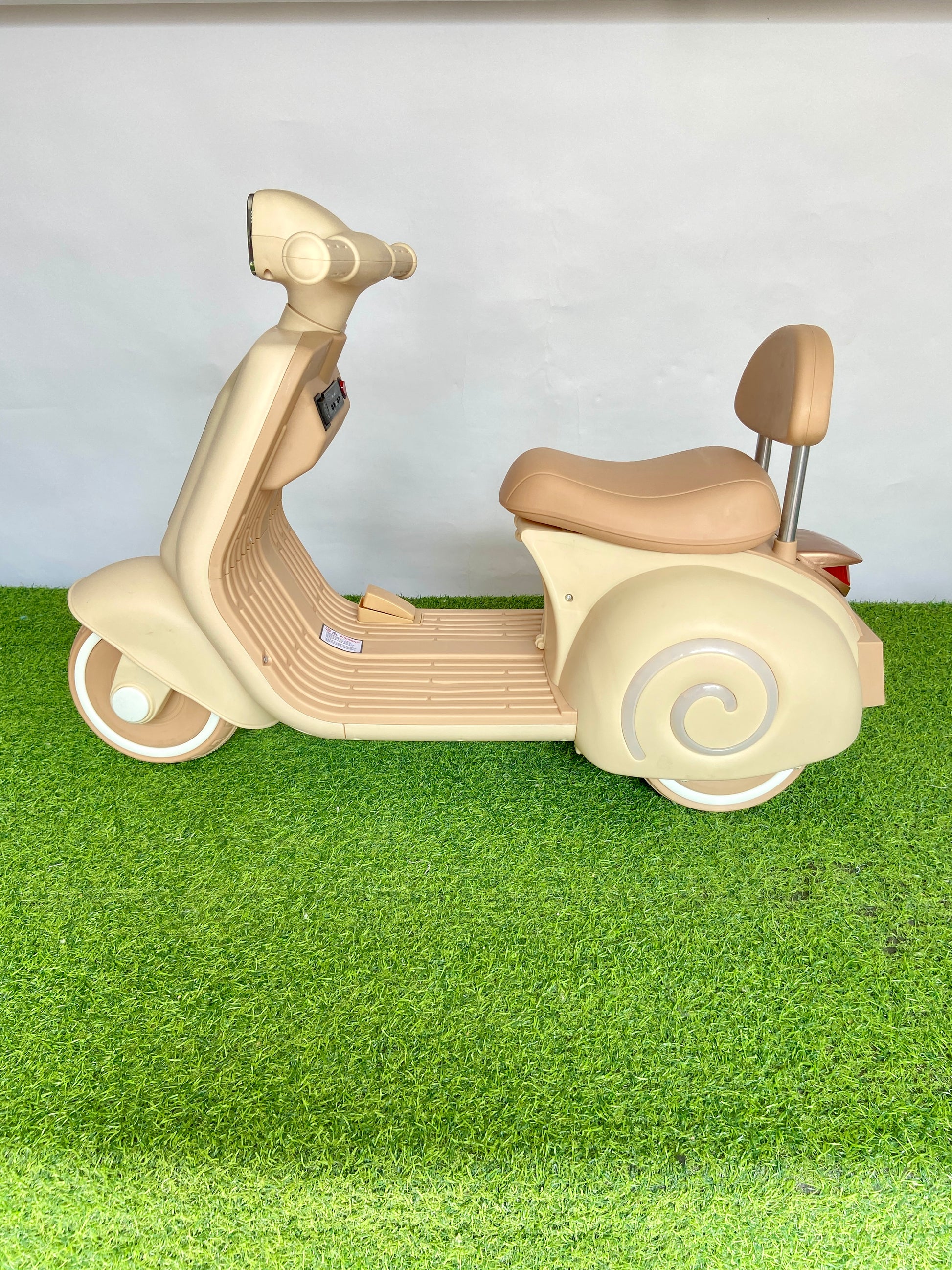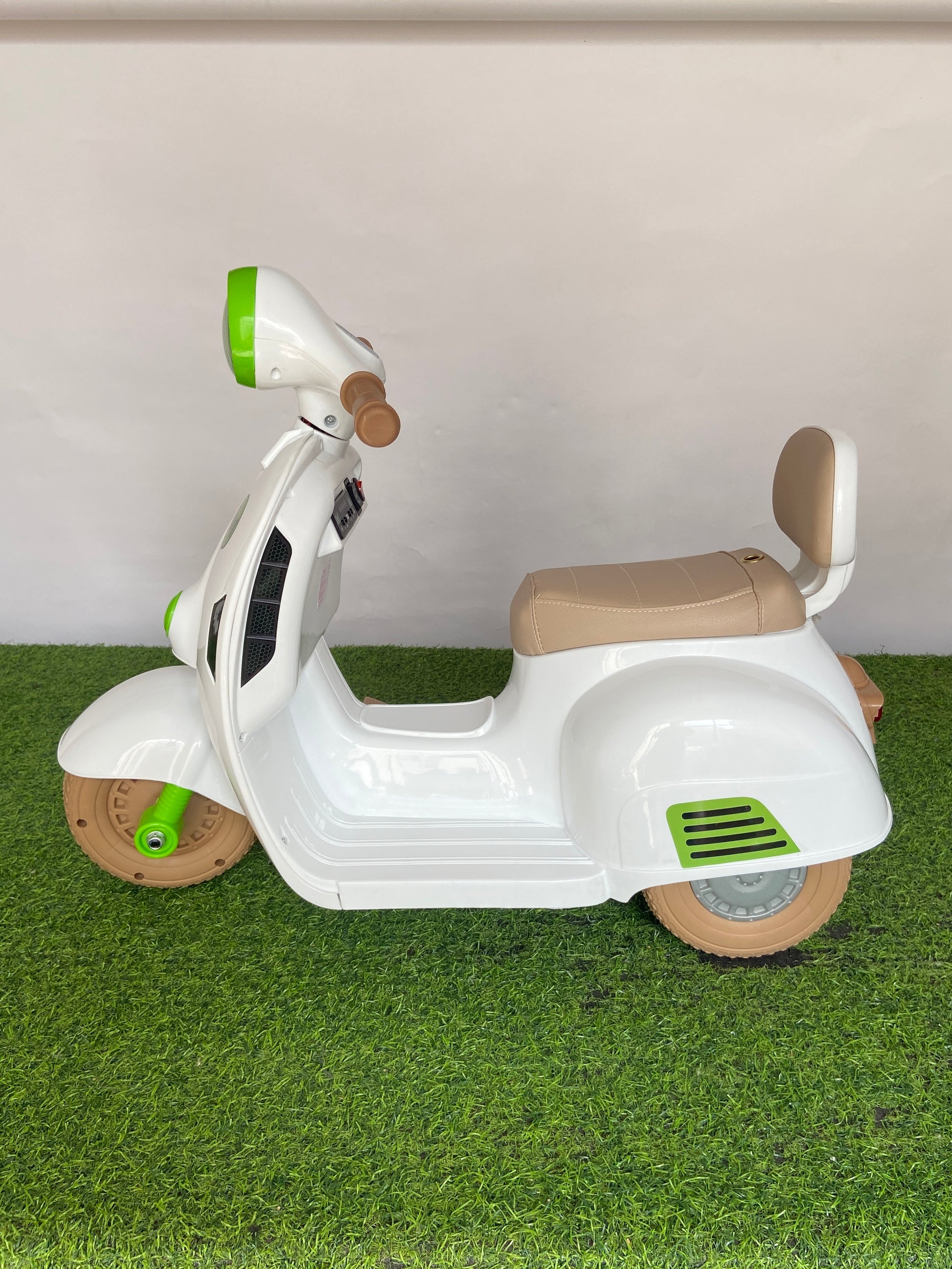 Premium electric ride-on bike with modern Vespa-inspired design